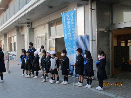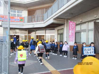 「おはようございます。」寒い朝ですが、気持ちの良いあいさつが聞こえてきます。火曜日は、あいさつ当番日です。外は寒いけれど、元気いっぱいのあいさつで心は温かくなりました。1年生も、全校にあいさつを広めるため、がんばっています。