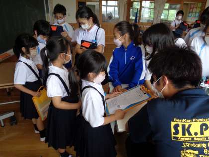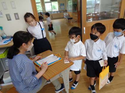 入学してあっという間に3ヶ月が過ぎました。学校生活に慣れてきた頃ですが、まだまだ知らないことが多くあるようです。その一つが、山本小学校にいる先生についてです。そこで、学校内にはどんな先生がいるのかを調査しに行きました。出会った先生に、名前と好きなものを紹介し、自分で作った名刺を渡すと、素敵なサインやシールを貰うことができました。多くの先生と話をすることができ、笑顔いっぱいで教室に帰ってきました。