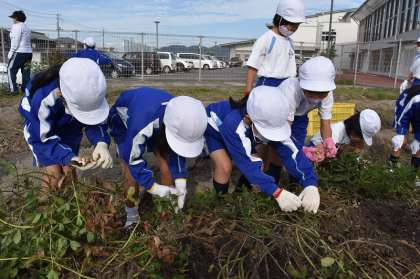 2年生が、学校横の畑で落花生の収穫をしました。