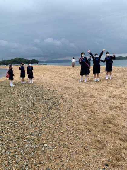 新型コロナウイルス感染症対策のため「県内の旅行×2日」となった修学旅行でした。ふるさとを思いきり堪能した2日間でした。(写真はエンジェルロード、二十四の瞳映画村)