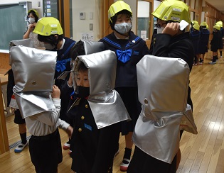 1年生にとって小学校で初めての避難訓練(地震)です。地震が収まった後、静かに防災頭巾をかぶって、上学年と一緒に自治会別の教室に移動ができました。