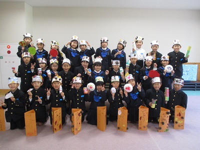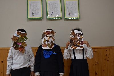 自然豊かな山本町には秋がいっぱい。学校や自宅周辺で、草花や木の実、落ち葉などをたくさん見つけました。それらを使って、生活科の時間に「あきランド」を作りました。お面を作って大変身した子どもたち。手作りおもちゃに大満足の子どもたち。いたるところに笑顔がはじけています。