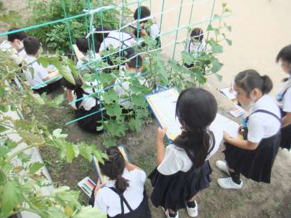 2年生は、生活科でピーマンやナス、ミニトマト、キュウリ等を育てています。水やりを忘れずに続けています。6月に入り急に大きくなり始めたので観察記録をとりました。ミニトマトは実も大きくなり、黄色くなってきました。キュウリも実がつき始め、収穫が今から楽しみです。