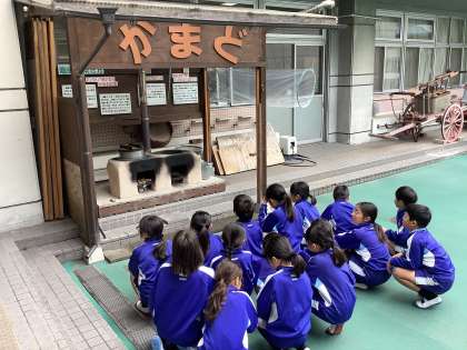 社会科でふるさと学芸館へ行ってきました。昔の道具を見るだけではなく、実際に使うことで昔の人たちの暮らしの大変さを実感しました。羽釜で炊いたごはんがとてもおいしかったです。