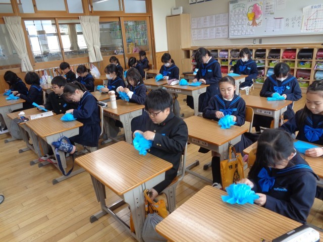 卒業式に向けて、式の準備や練習が始まりました。4年生の担当はアーチの花飾りを作ることです。薄い紙を破らないよう、1つ1つに思いを込めながら丁寧に仕上げることができました。
