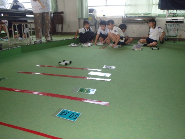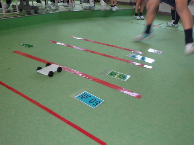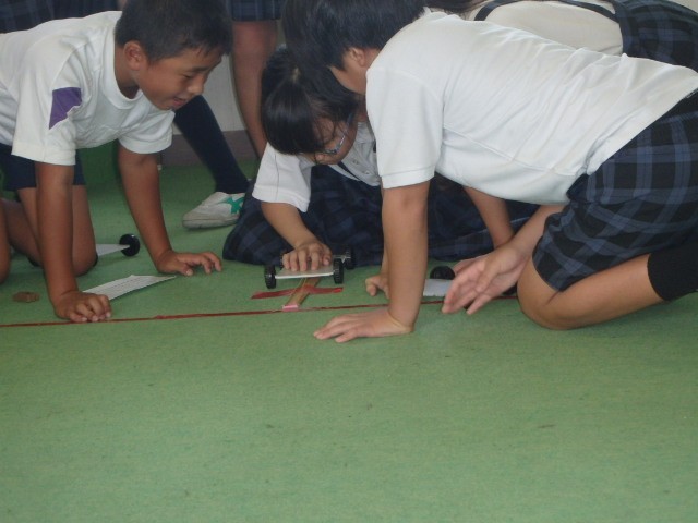 3年生が「ゴムで動く車」を使って、ねらった位置にどれだけ近づけられるかを競うゴールインゲームをしました。