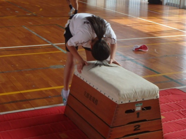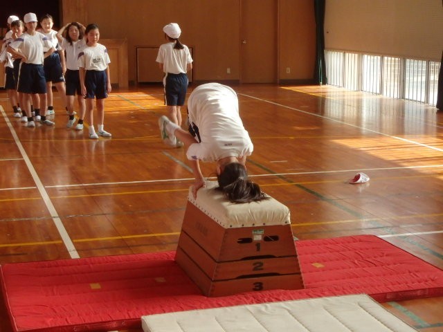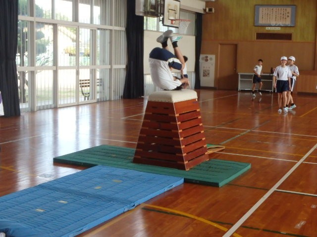 体育館に入って驚きました。8段の跳び箱の上を台上前転しています。5年生の体育です。