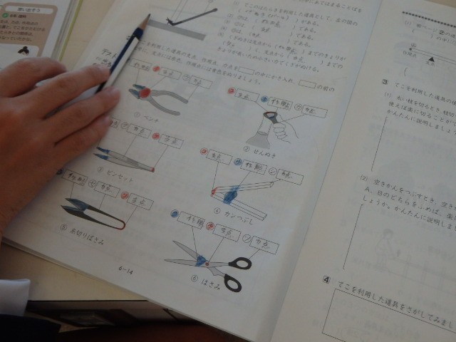 てこを利用した道具は身の回りにたくさんあります。ペンチ、栓抜き、ピンセット……。それらの「支点」「力点」「作用点」を子どもたちは解明していきました。