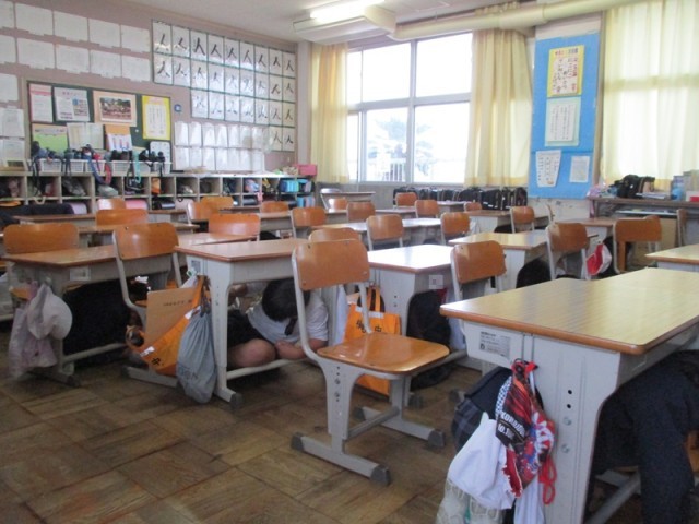 1枚目の写真を見て、「なぜ机など撮っているのだろう。」と思われた方がいるかもしれません。机の写真ではありません。机の下に上手に避難している様子です。