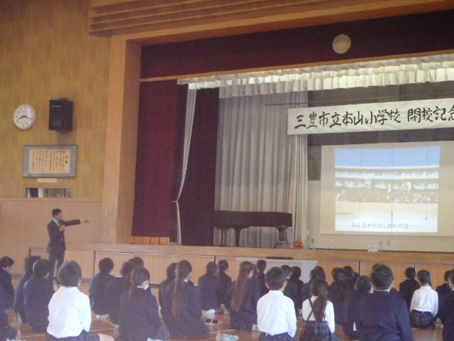 閉校記念式典・「ふるさとの昼べ」を終えての、初めての登校日。全校朝会で、支えてくれた地域の皆様のことを話しました。