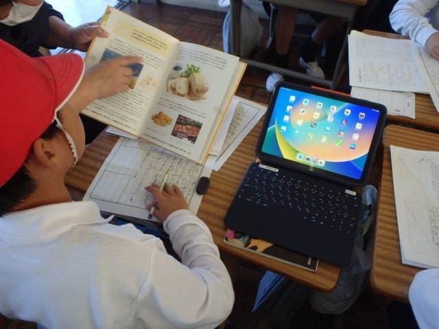 子どもたちはタブレット端末や本で調べながら、「和食と洋食」「ベッドとふとん」「和菓子と洋菓子」など、自分が興味をもった「和と洋」をまとめました。