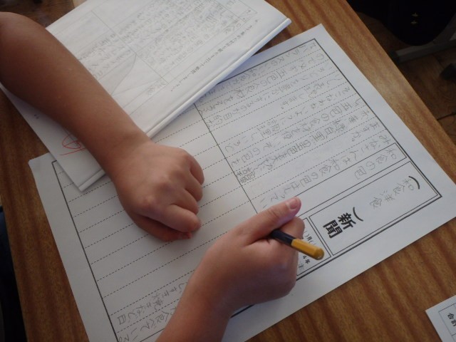 「ふるさとの昼べ」で懐かしい授業を繰り広げた4年教室で、今日は、真剣勝負の「和と洋新聞づくり」を行いました。