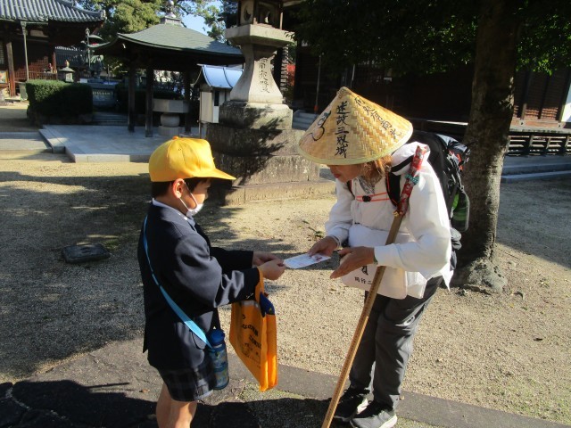 今日は2年生が、本山寺にお接待に行きました。手作りのお土産を、お遍路さんに渡しました。
