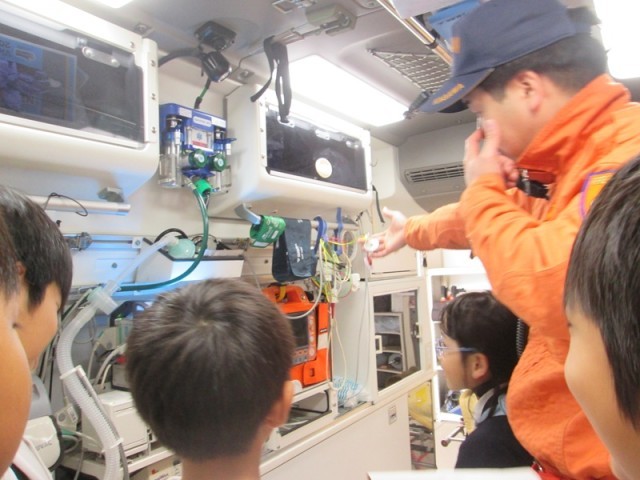 救急車の中を見せてくださったり、50㎏のものを、いかにして楽に持ち上げられるかを体験させてくださったり、昨年度とはまた違った体験ができました。