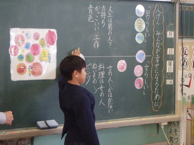 授業の中で、「お母さんが『スカートは男の人も着るよ。』と言っていた。」「お父さんも料理の手伝いをしている。」という子どもの発言がありました。ご家庭での言葉や振る舞いが、いい人権教育になっているのだなと感じました。