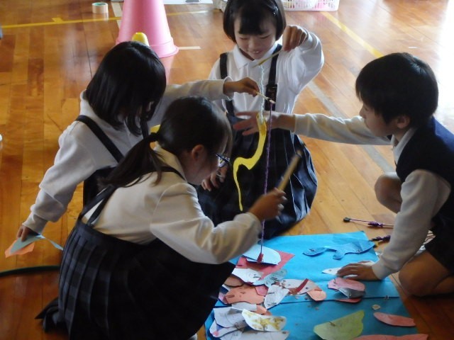 手をとって遊び方を1年生に説明している2年生を見ていると、この1年間の成長がよく分かりました。それぞれの屋台が魅力的で、また客寄せの看板も見ごたえがありました。