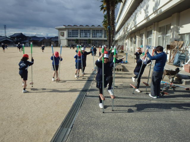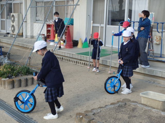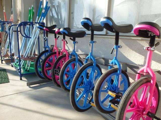PTAの協力を得て注文していた、新しい竹馬と一輪車が届きました。