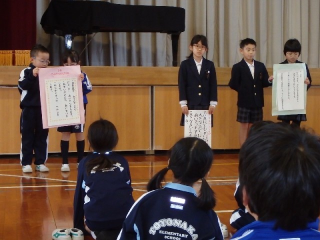 今朝の全校集会では、3学期の学級委員の任命と、各学年の取組の発表を行いました。