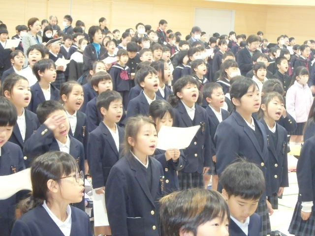 5校の子どもたちがそろったら、全員で初の校歌斉唱。曲の美しさと、数百人の声の迫力は、「この子たちならいい学校を創る」と思わせるに十分でした。
