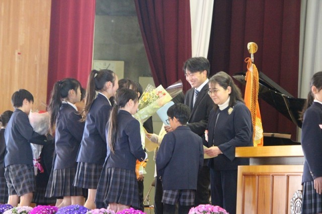 離任式では、花束が学校を去る先生に手渡されました。