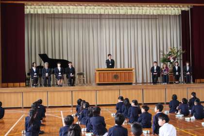 新任式では、新しく着任した9名の教職員が、音楽、キャンプ、漫画など、いろいろな自分の「好き」を紹介しました(写真左)。先生方のたくさんの「好き」と出会いながら、子どもたちにもいろいろなことに興味をもってほしいと願っています。