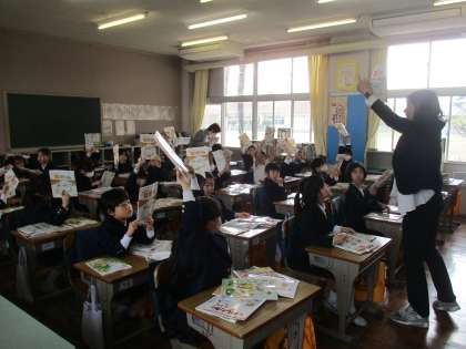 右側の写真は、新しい教科書を手に、喜びいっぱいの子どもたちの様子です。