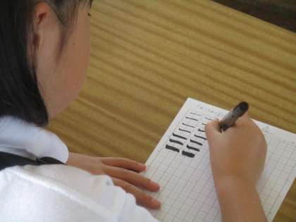 子どもたちは、「一」の文字をいろいろな太さで試しながら、たった一本の線でも美しさが表現できることを学びました。