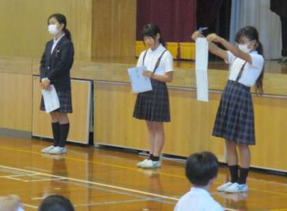 また、今日の全校朝会で、各委員会から全校生にそれぞれのめあてを呼びかけました。