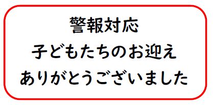 【お礼】警報対応 公開日 2024/05/28 更新日 2024/05/28 学校全体 本日は、警報発令に伴う子どもたちの引き渡しにご協力いただき、ありがとうございました。降雨の予測が難しく、お知らせが遅れ、ご迷惑をおかけしましたが、おかげさまで大きな混乱もなく、引き渡しを行うことができました。 今後も、子どもたちの安全のため、緊急に対応いただくこともあるかと思いますが、引き続き、ご協力をお願いします。
