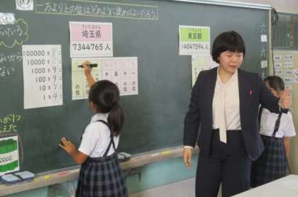 今日、3年生が算数の「一万をこえる数」の研究授業を行いました。これまでの学習で子どもたちが読んできたのは、一万の位までの数でしたが、この日の学習で十万、百万、千万の位まで学習しました。