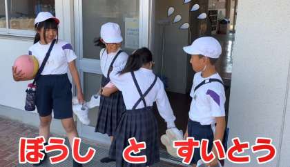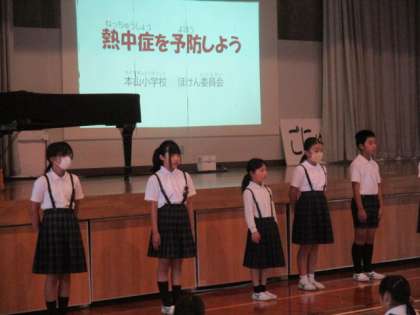 朝の全校朝会で、保健委員会の発表でした(写真1枚目)。休み時間のドッジボールの場面を取り上げ、「熱中症予防」の大切さをビデオやプレゼンテーションで伝えました(写真2枚目)。