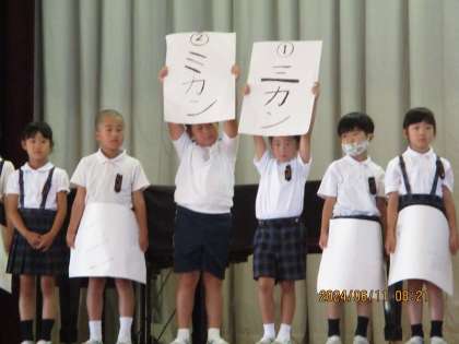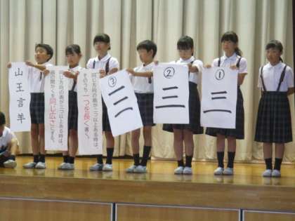 6月11日の朝の表現タイムでは、2年生が書写の学習の生かして「ミ」と「三」の書き方の違いを発表しました(写真1枚目)。期せずして、今日の表現タイムは、4年生が美しい「三」の書き方について発表しました(2枚目)。それぞれの画の長さや間隔が美しさの秘訣になります。そして、この書き方は「山」「王」「言」「羊」にも生かすことができます。