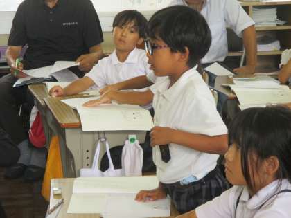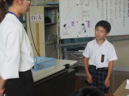 「ぼく」役になった子どもたちは、友達を助けたいという強い思いをもって懸命に語ります。その姿が参観する先生方の心を打ちました。そして、役割演技をする子だけでなく、それを見ている子どもたちも「ぼく」の立場に立ち、一緒に応援していました。