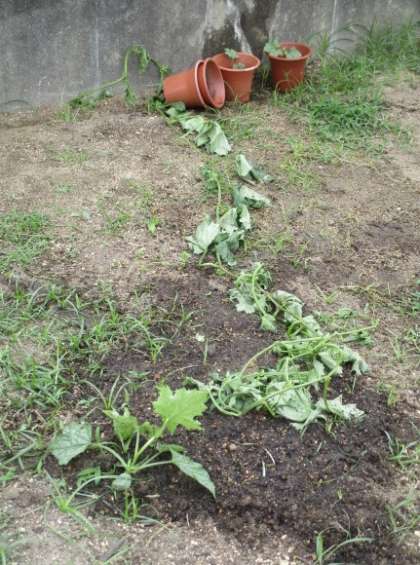 雑草の中から芽を出したヘチマの1本がたくましく成長していたのですが、おそらく雑草と間違われたのでしょう。根っこから抜かれていました。「まだ生き返るかもしれない」と、4年生の男の子たちがもう一度植え付け、水やりを続けていました。