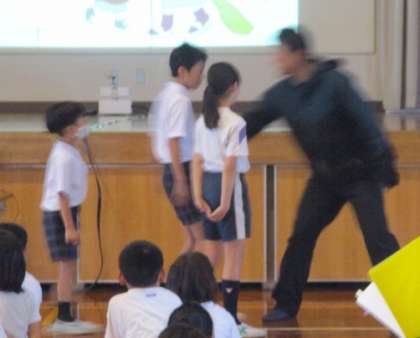 今日、学校内に不審者が現れたという想定で不審者避難訓練を実施しました。暴れる不審者を止めるのは、大人二人がかりでも容易ではありません。では、子どもたちにできることは何か。安全・安心まちづくり教育隊の方が教えてくださった「2つの身に付けたい力」はこれです。