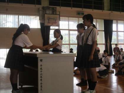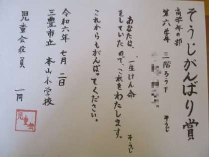児童会役員が、掃除を頑張っている人を見つけていたのが昨日。頑張っている人たちへの表彰状を作っていたのが昨日の放課後。そして今日の全校朝会で、さっそくその表彰が行われました。子こどもたちの行動力に脱帽です。