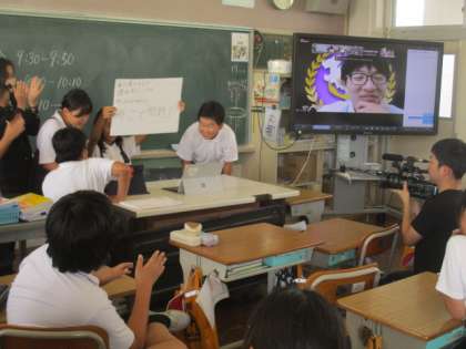 まずは、田原小学校の子どもたちが京都を紹介するプレゼンのすごさにびっくり。「うわあ、かっこいい!」という声がもれてきました。負けじと本校の子どもたちも、持ち前の声と体の表現力で、自分たちの学校や方言についてクイズ形式で紹介しました。