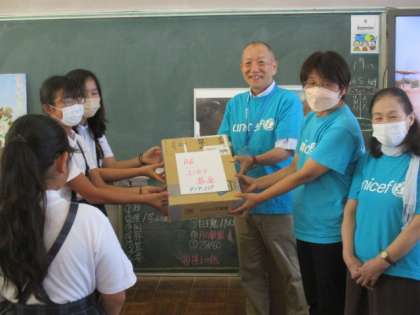 最後に、全校生に協力してもらったユニセフ募金を協会の方に手渡しました。この募金で、一人でも多くの「マリア・ジョンちゃん」が増えますように。