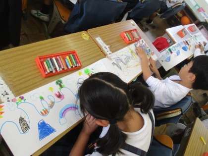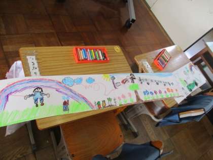 長い画用紙に自由に線を引き、その周りに自分の好きな絵を描いていく。すると、その絵はおのずと物語を語り出します。1年生の図工「せんのぼうけん」です。