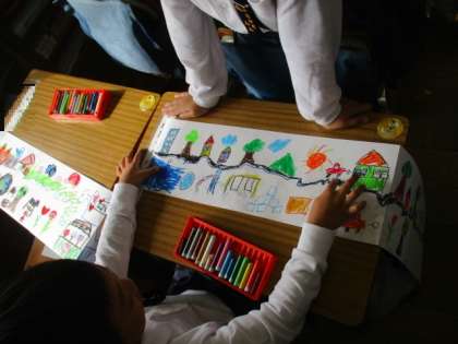 動物園を描いている子、屋根は木で壁は石の家を描いている子、野菜をたくさん植えている子。発想は無限大です。