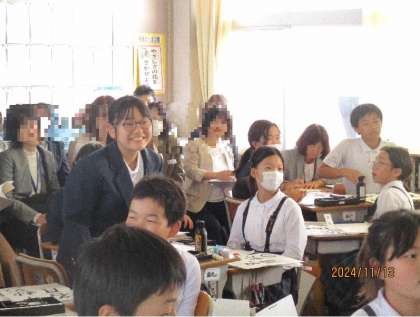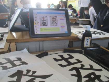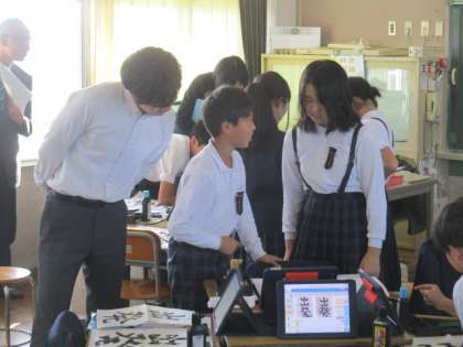 古来の文化である書とICT。静のイメージがある書写と話し合い。一見相反するような二つのことが見事にコラボした斬新な授業に、参観の先生方も感心していました。