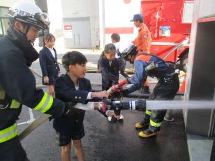 はしご付き消防自動車に乗せてもらったり、放水をしたり、もしかしたら一生のうちに一度しかできないようなことを経験させてもらいました。