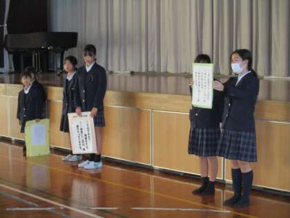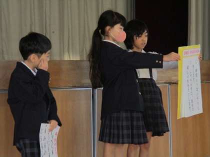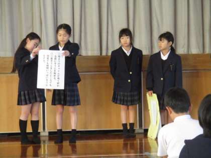 今日の全校朝会で、各学年の代表が、月目標「きれいな学校にしよう」に向けた取組を発表しました。