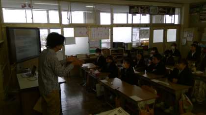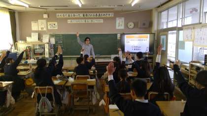 三豊総合病院から講師の先生を招いて、喫煙防止教室を行いました。事前に行ったアンケート調査を基に、クイズ形式でたばこの害について学びました。