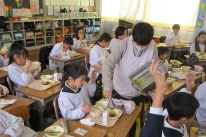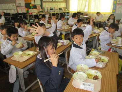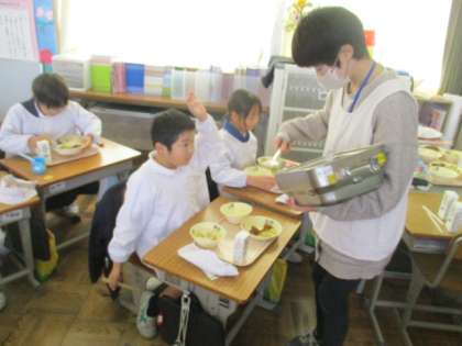 金曜日に3年生が収穫したブロッコリーが、今日の給食に登場しました。写真は、その3年生の教室です。「ブロッコリーのおかわりがほしい人」と声をかけると、たくさんの子が手を挙げました。