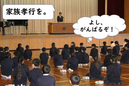 終業式の校長式辞で、宿題を出しました。内容は「家族孝行をすること」。小さいころからわがままを聞いてもらったり、面倒を見てくれたりした家族に、何か一つ、普段とは違う孝行をする、というものです。