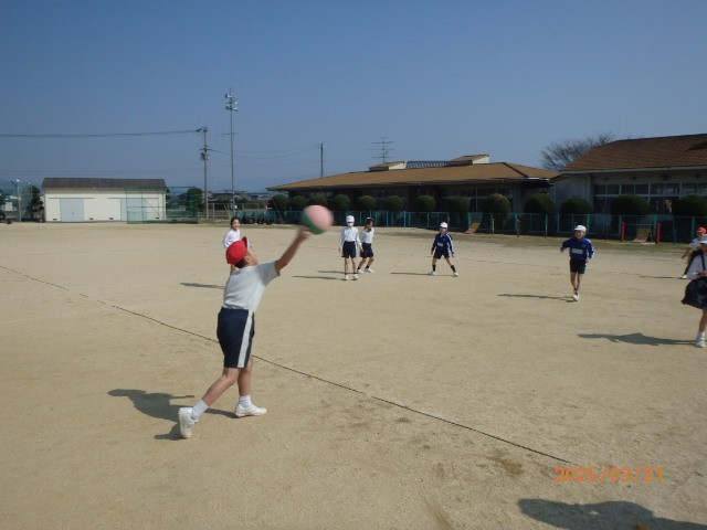 今日、運動場でみんなで楽しくドッジボールをしているなと思ったら、3年生でした。
