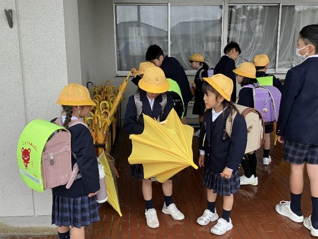 やさしい雨の風景 公開日 2025/04/11 更新日 2025/04/11 学校全体 雨の中を1年生が登校してきました。玄関では、上級生が待っています。 傘のたたみ方が分からない1年生に、1年先輩の2年生が、「こうやってパタパタとして、くるくるっと回してたたむんで。」とお手本を見せてあげています。5年生が傘の置き場所を教えてあげています。 やさしい雨の風景でした。