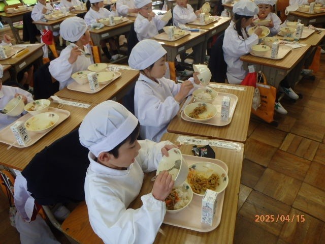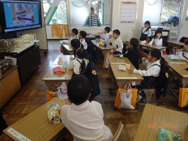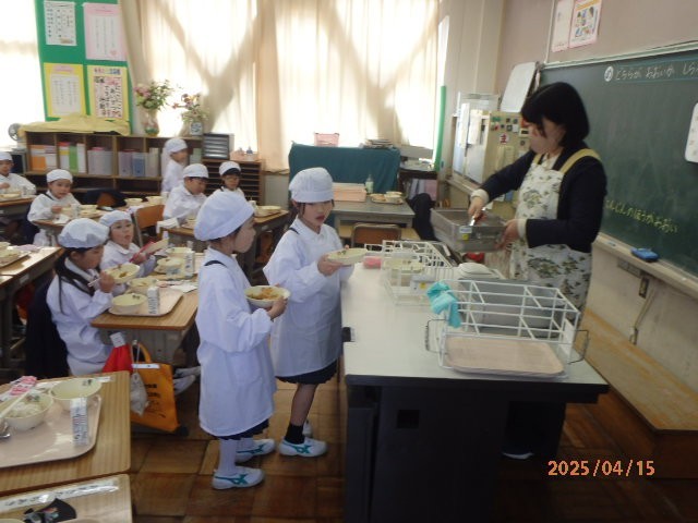 今日は、1年生が初めての給食を食べました。「ぶたどん」に入っているなるとには「祝」の文字が書かれていました。給食も1年生をお祝いしています。