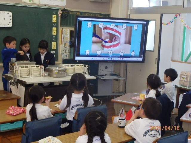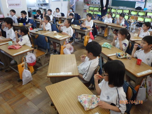 今日は、給食が始まったばかりの1年生の教室に赴き、1年生の歯磨き指導をしました。